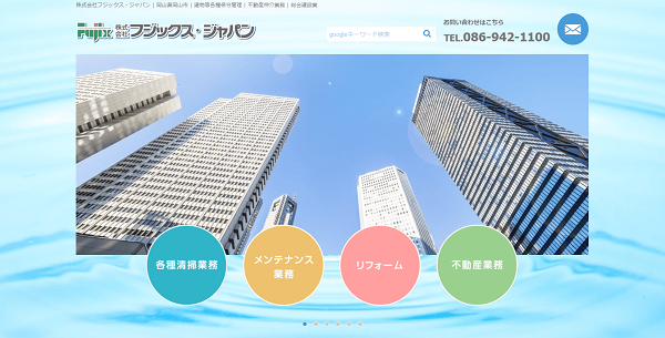 | 日常清掃 | 定期清掃 | 病院清掃 | アパート、マンション共用部の日常清掃 | 貯水槽清掃作業 | 衛生防除作業 | ハウスクリーニング | リフォーム | 不動産売買 |